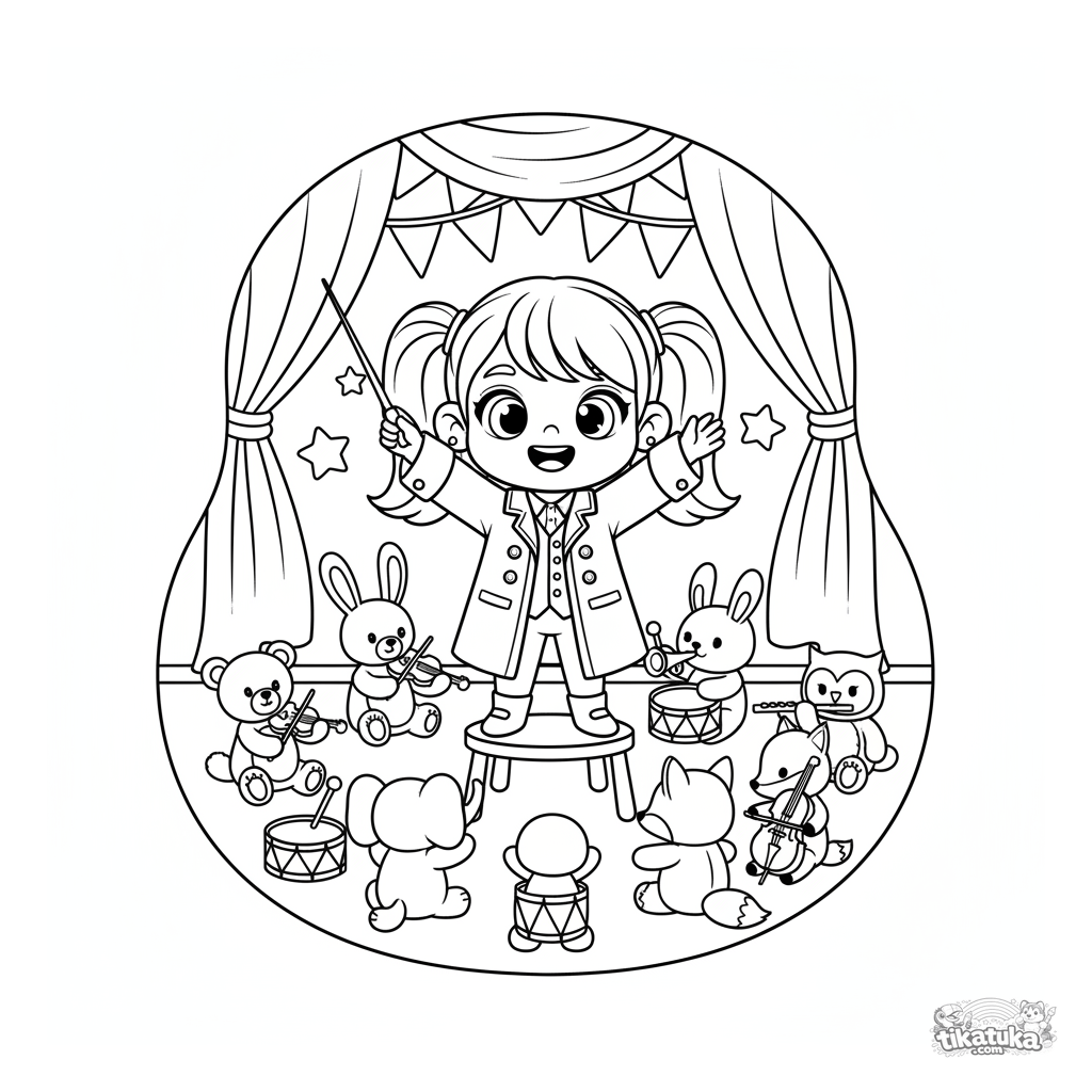 Página para colorir para crianças 7-9: uma menina regendo uma orquestra de brinquedo de pelúcias em um salão festivo. Cena imaginativa.