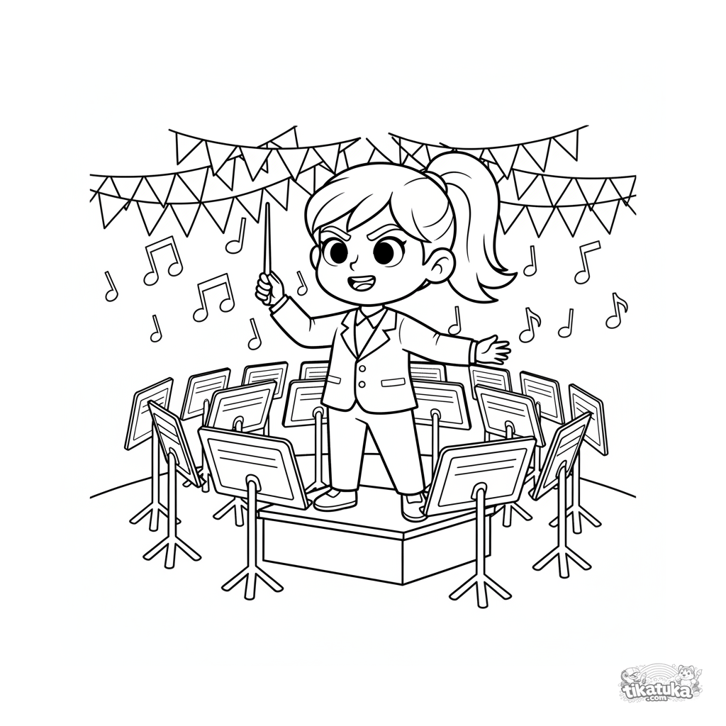 Página para colorir para crianças 7-9: uma menina maestrina lidera uma orquestra em um salão festivo. Pose dinâmica, detalhe moderado.