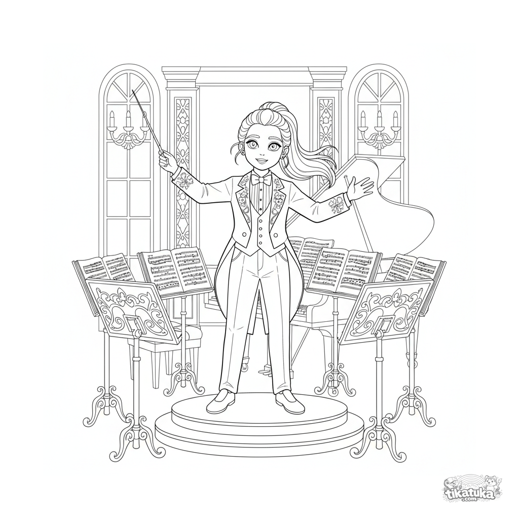 Página para colorir para crianças de 10-12 anos: uma menina como maestrina conduz apaixonadamente uma orquestra de um pódio em um salão festivo decorado. Ilustração detalhada de corpo inteiro.