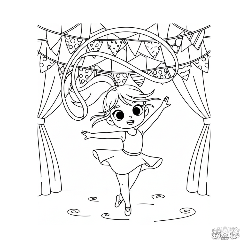 Página para colorir para crianças 7-9: uma menina dançando alegremente com uma fita longa em um salão festivo. Pose dinâmica, cabelo voando.