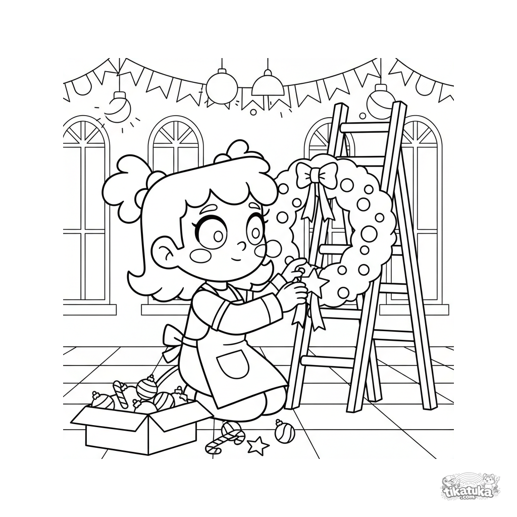 Página para colorir para crianças 7-9: uma menina decora uma grande grinalda festiva em um salão.