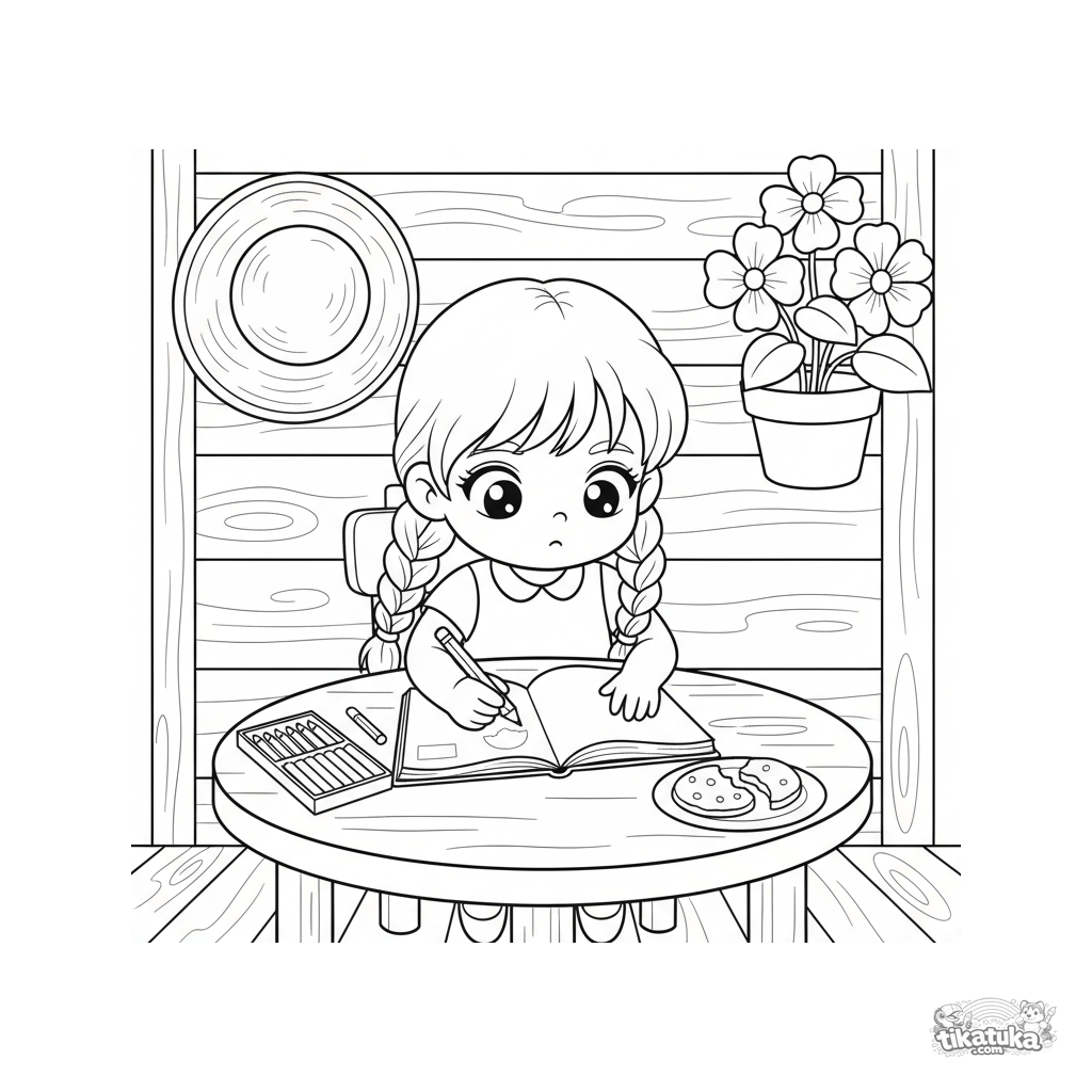 Página para colorir para crianças 4-6 anos: menina desenhando em um caderno na mesa da varanda. Com lápis e flores, cena criativa.