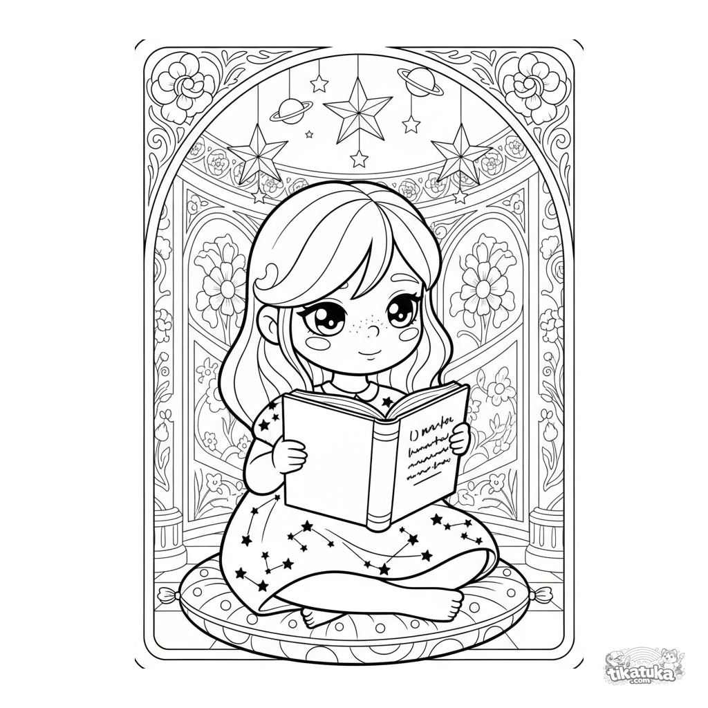 Página para colorir para meninas 7-9 anos: uma menina vestida de constelação lê um livro sob estrelas de papel penduradas. Detalhe moderado.