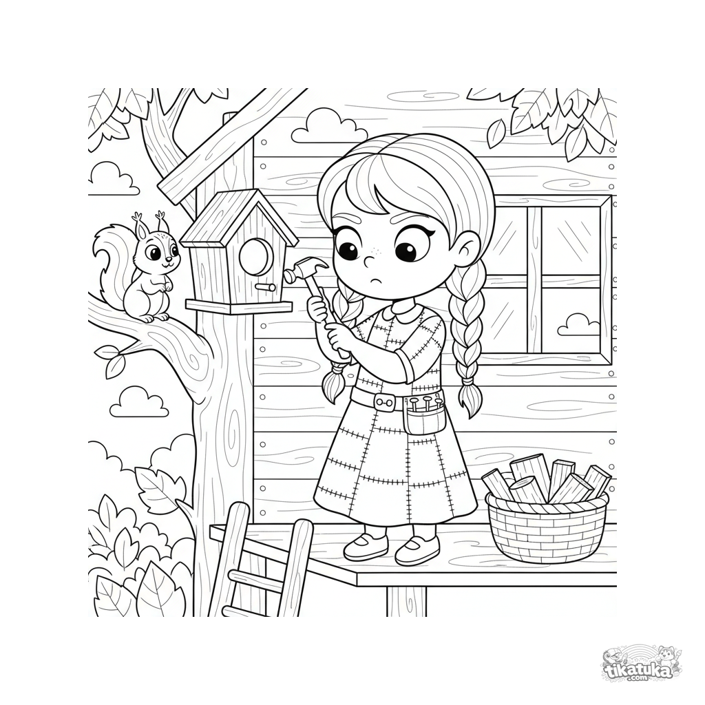 Página para colorir de uma menina em vestido de retalhos construindo uma casa de pássaros em sua casa na árvore. Cena com ferramentas e um esquilo para crianças de 5 a 8 anos.