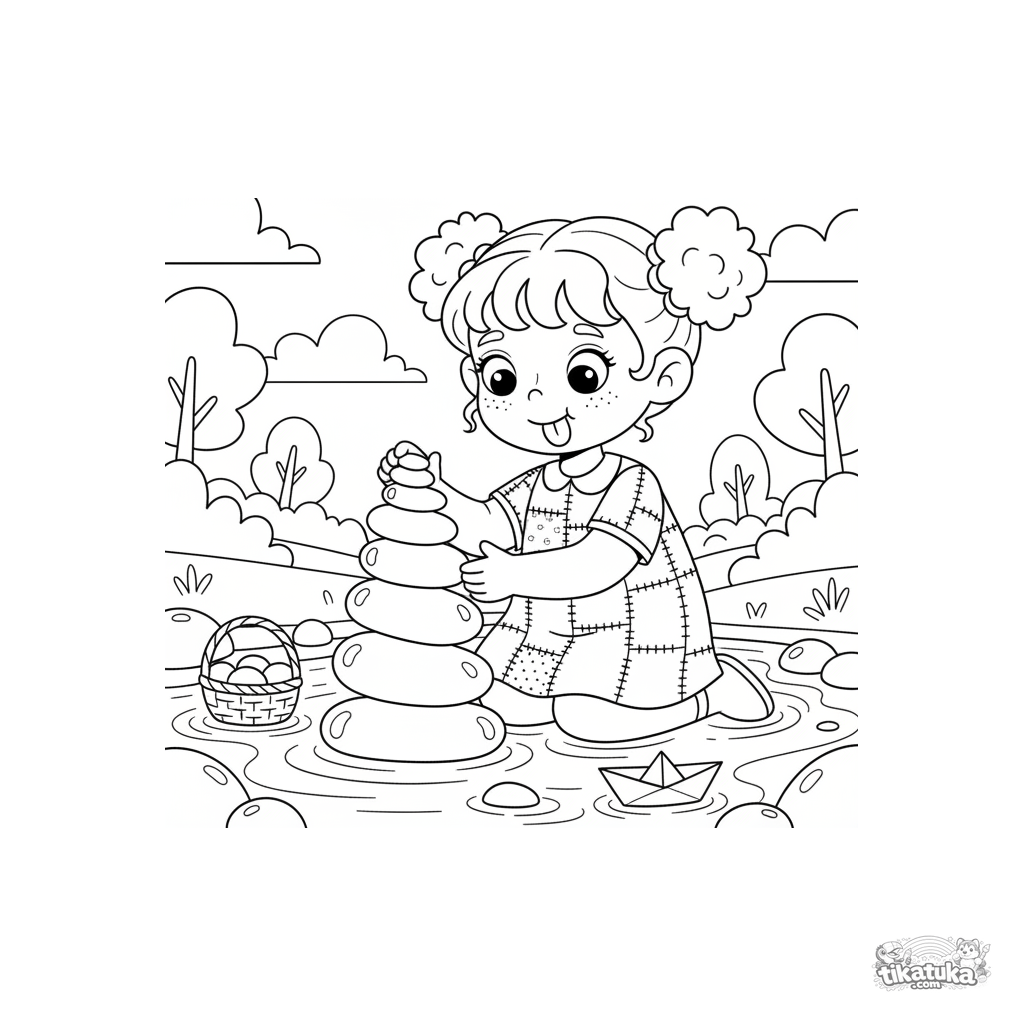 Página para colorir para meninas: uma criança de vestido de retalhos constrói uma torre de pedras de rio. Para 5-8 anos. Cena com cesto e barco de papel.