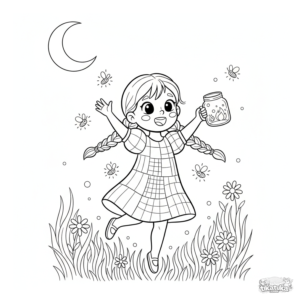 Página para colorir para meninas: uma criança de vestido persegue vaga-lumes em um prado de verão. Para crianças de 5 a 7 anos.