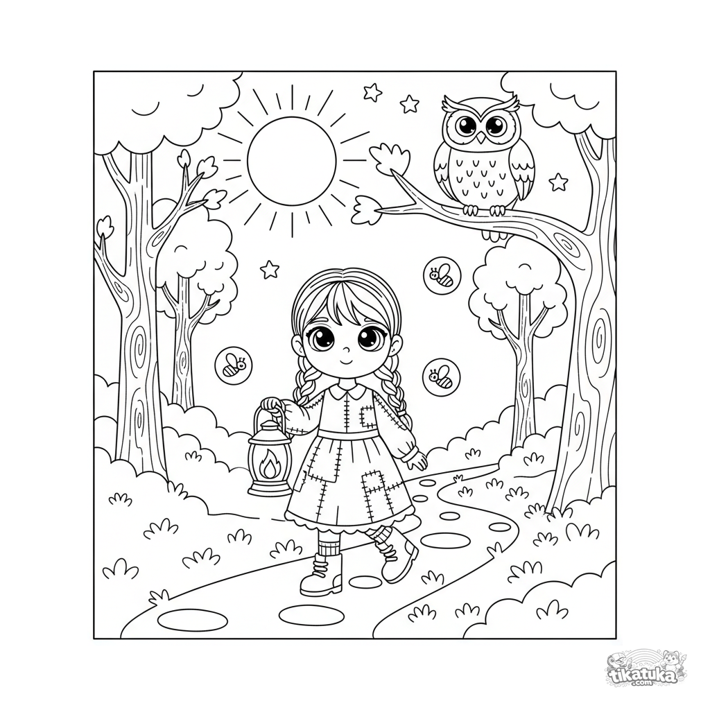 Página para colorir para meninas: uma menina de vestido anda por uma trilha na floresta com uma lanterna. Para crianças de 4-6 anos. Noite de lua com vaga-lumes e uma coruja.