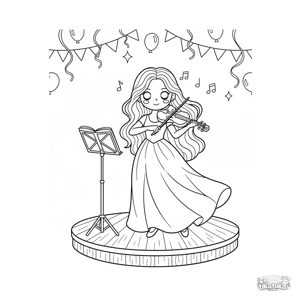 Página para colorir para crianças 7-9: uma menina estilo anime tocando violino em um palco em um salão festivo. Cena de performance musical.