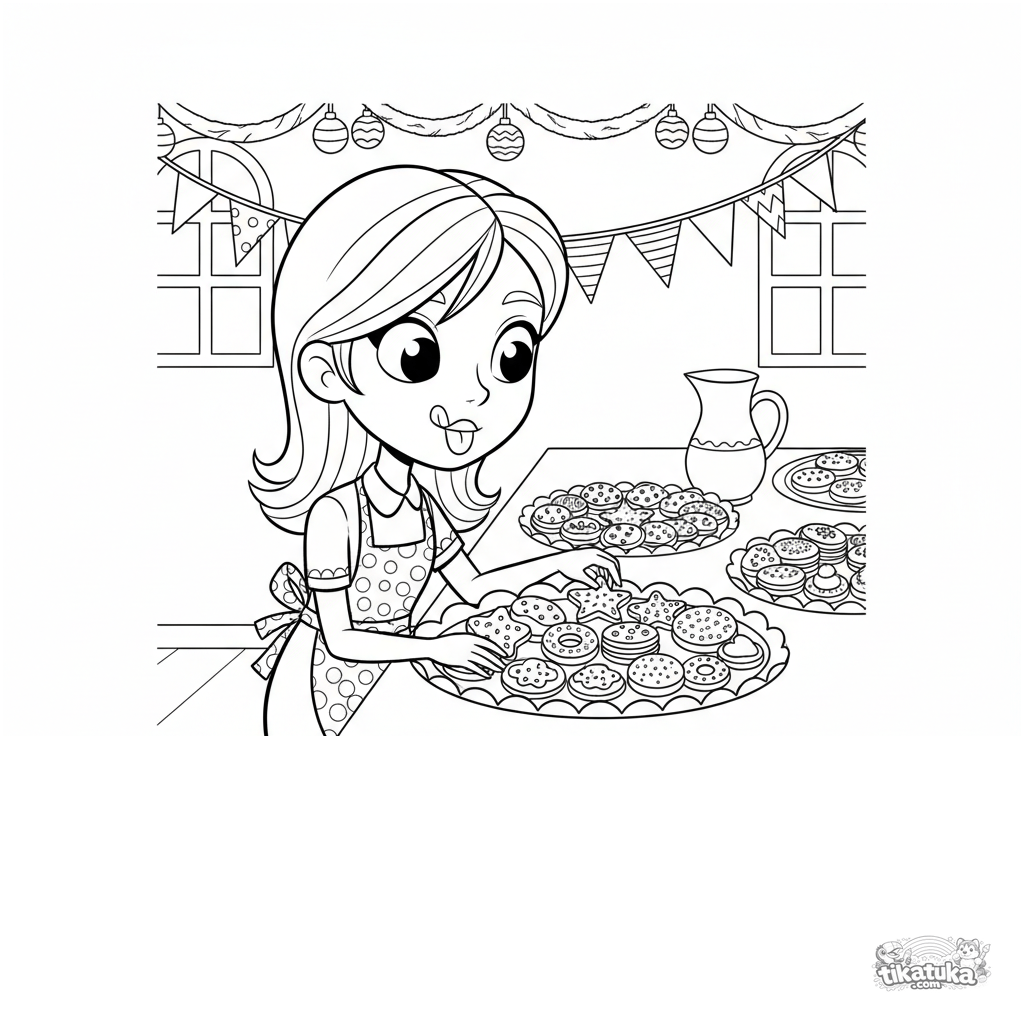 Página para colorir para tweens 7-9: uma menina com avental arruma biscoitos em uma bandeja em um salão festivo. Cena de preparar guloseimas.