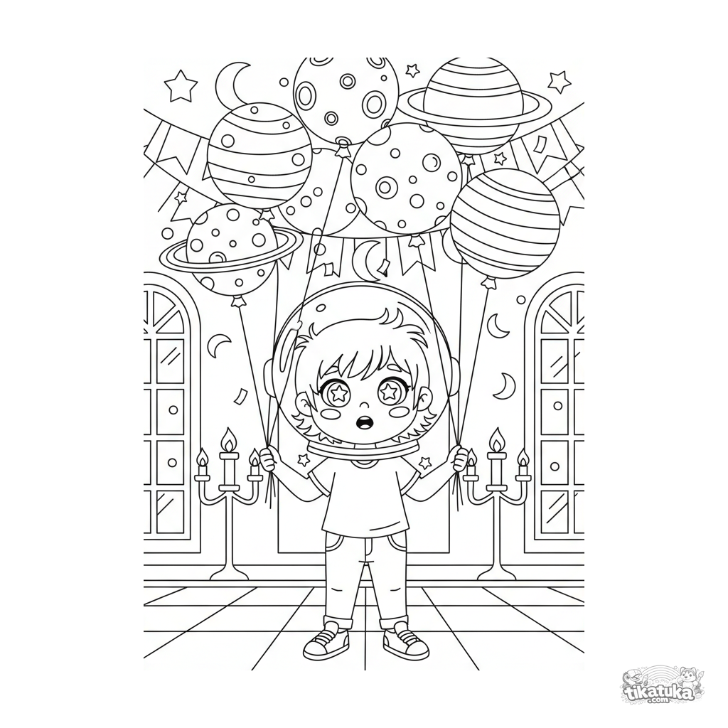 Página para colorir para 4-6 anos: uma menina com capacete de astronauta segurando balões planetas em um salão festivo. Formas planas limpas, cena clara, figura completa.