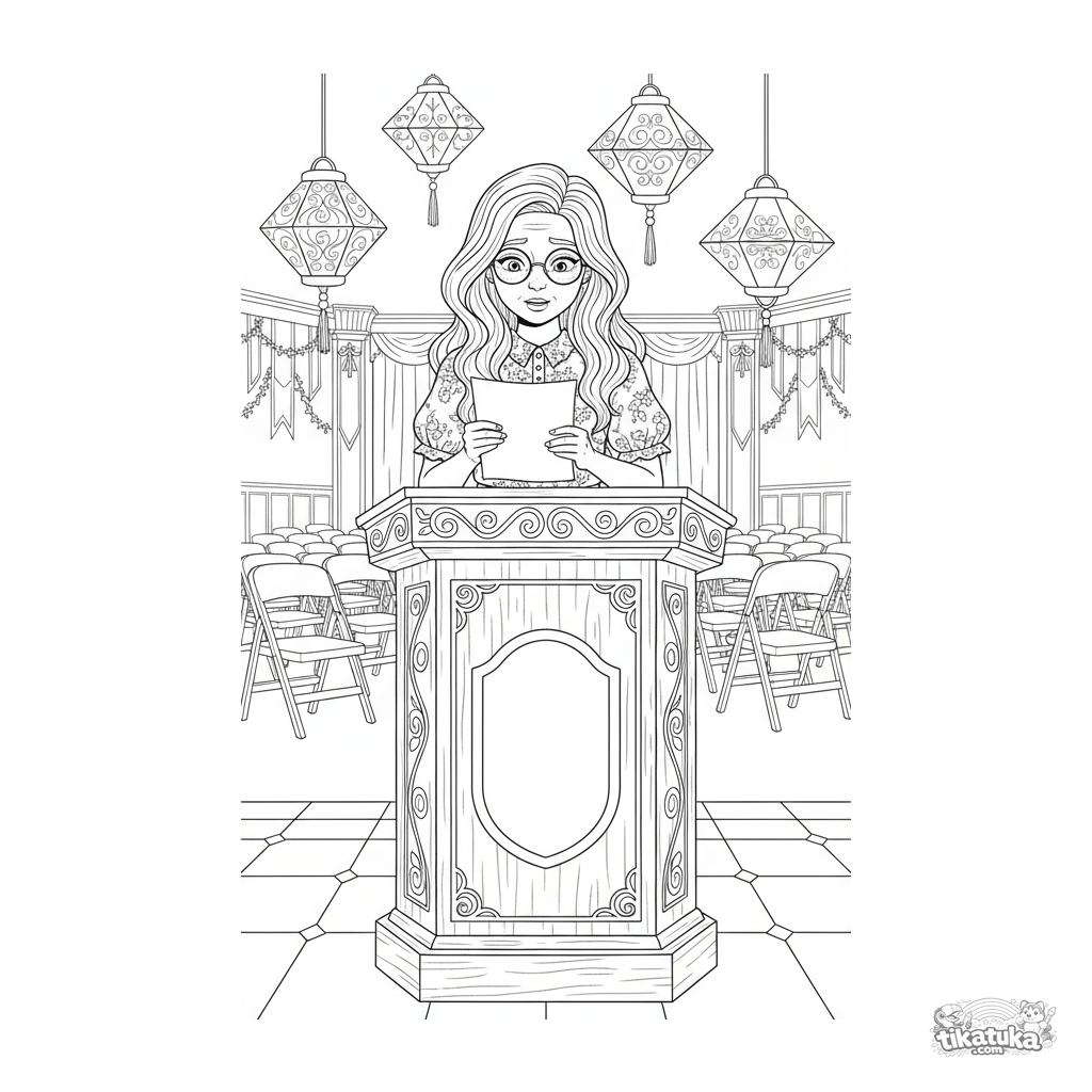 Página detalhada para colorir para crianças maiores 10-12: uma menina de óculos lê um poema de um púlpito em um salão festivo decorado.