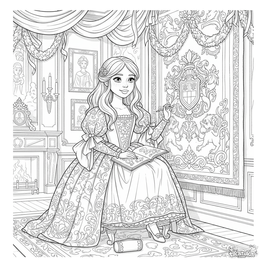 Página para colorir complexa para crianças 10-12: uma menina com vestido histórico desenha as decorações de um salão de baile.
