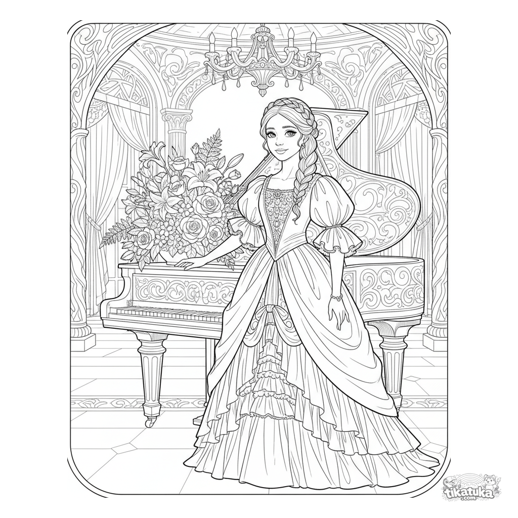Página para colorir detalhada para meninas 10-12 anos: uma menina com vestido de baile histórico está pensativa junto a um piano de cauda em um suntuoso salão festivo, com lustre e arranjo floral.