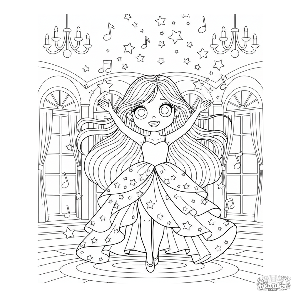 Página para colorir para crianças 7-9: uma menina com vestido mágico conduz faíscas e notas musicais em um salão festivo.