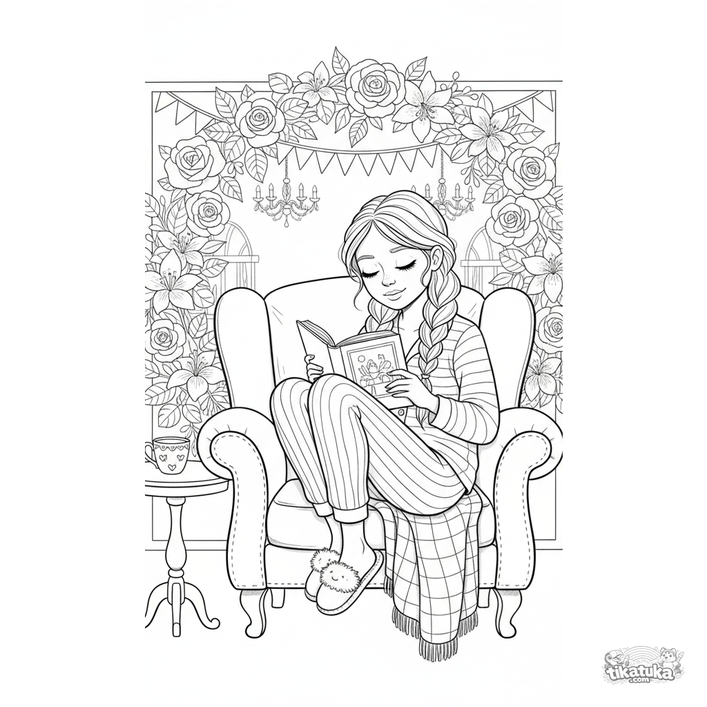 Página para colorir detalhada para meninas 10-12: uma cena aconchegante de uma menina de pijama lendo um livro em uma poltrona sob um arco floral em um salão festivo. Muitos detalhes texturizados.