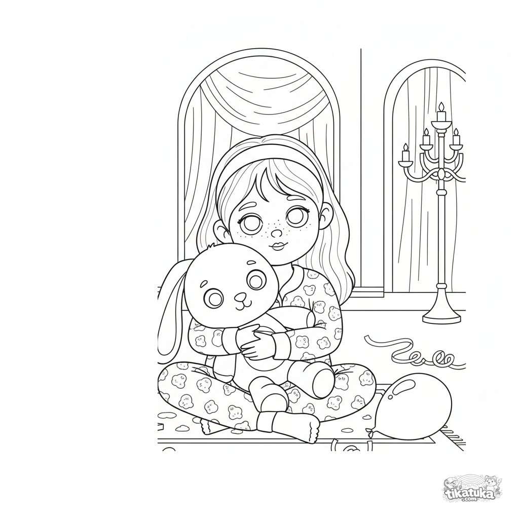 Página para colorir para crianças de 4-6 anos: uma menina de pijama aconchegante senta no chão de um salão festivo com um coelho de pelúcia após a festa. Cena simples, formas claras.