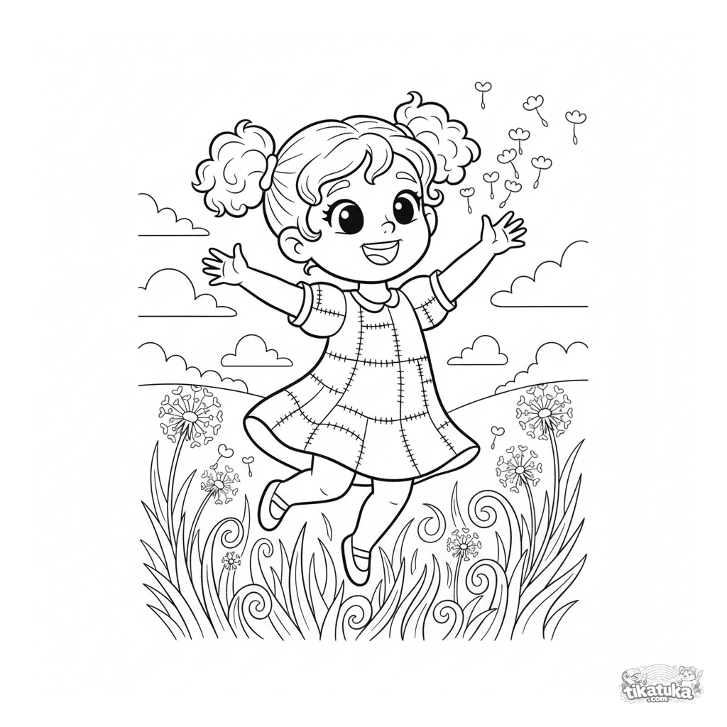 Página para colorir para meninas: uma menina alegre em vestido de retalhos corre por um prado pegando sementes de dente-de-leão. Para crianças de 4 a 6 anos.