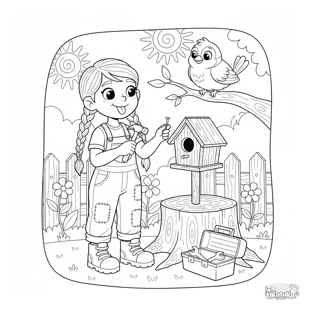 Página para colorir para meninas de 4-6 anos: uma menina alegre de macacão conserta uma minúscula casa de pássaros num toco de árvore, observada por um pardal.