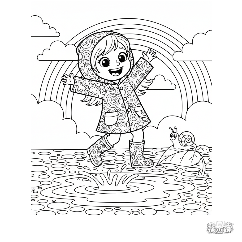 Página divertida para colorir para meninas de 4-6 anos: uma menina de capa de chuva brilhante pula em uma poça sob um arco-íris. Cena clara e positiva.
