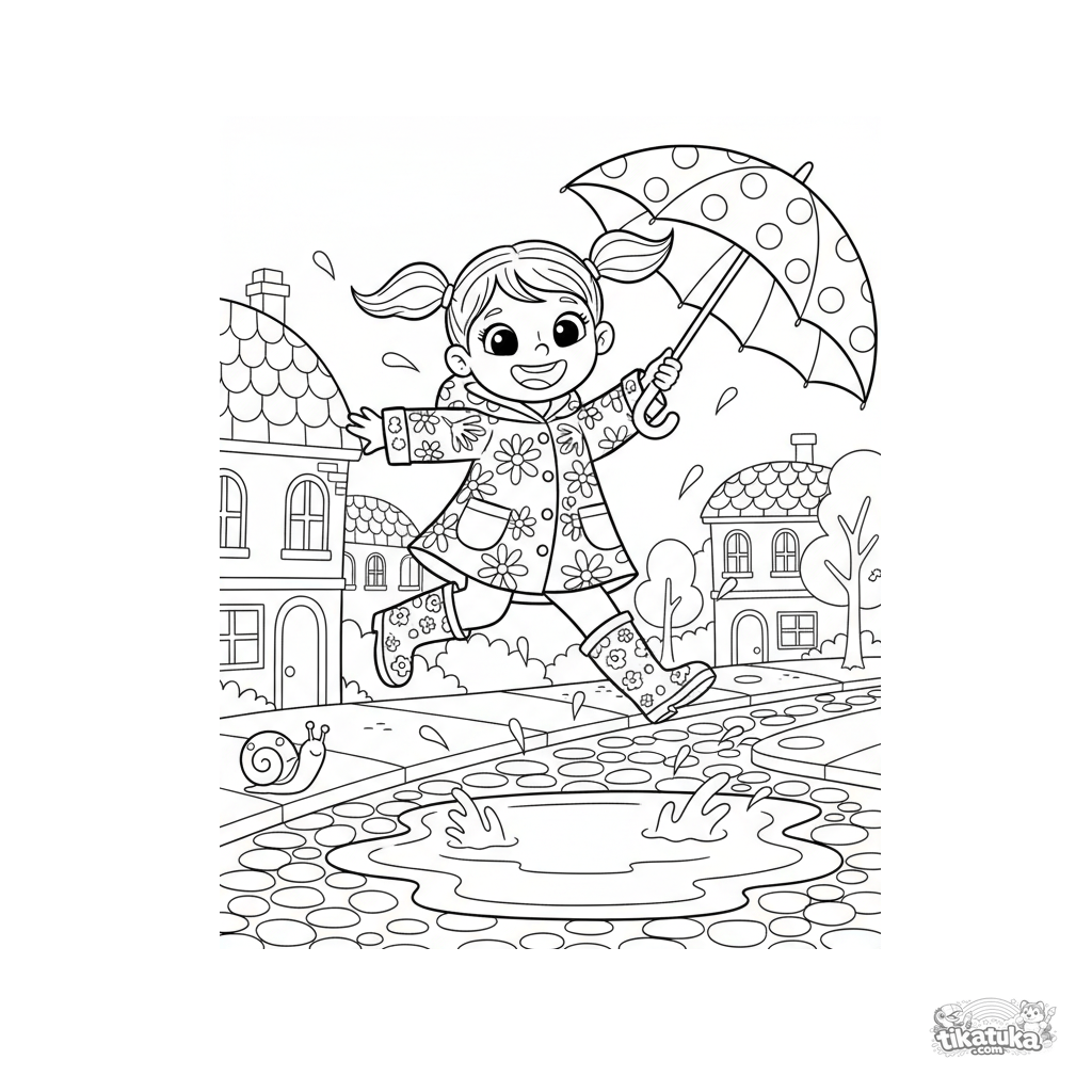 Página para colorir para meninas: uma menina alegre de capa de chuva pula em uma poça com guarda-chuva. Para crianças de 3 a 6 anos. Cena brilhante e simples.