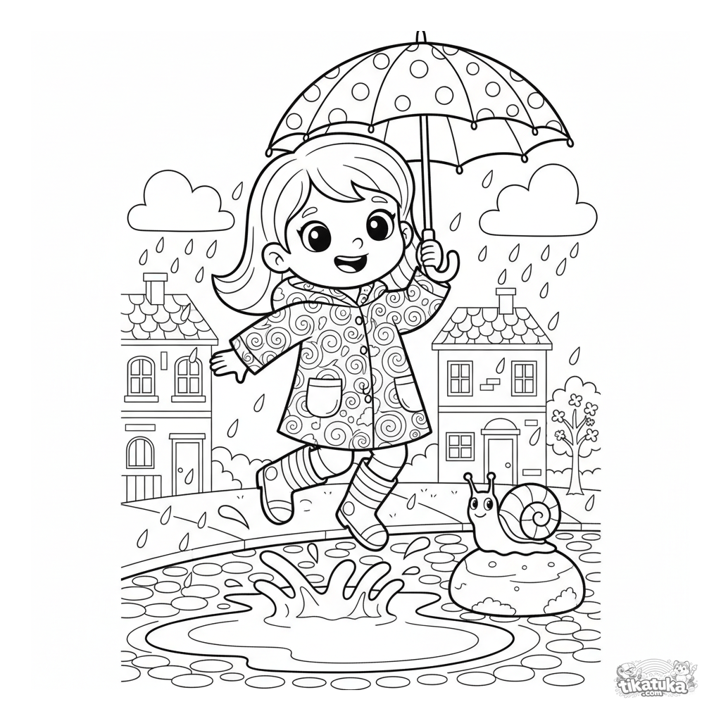 Página para colorir de uma menina feliz de capa de chuva pulando em uma poça sob um guarda-chuva. Para crianças de 3 a 6 anos.