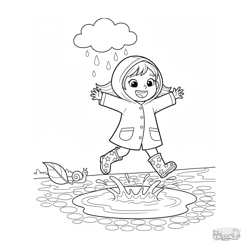 Página para colorir de uma menina feliz de capa de chuva pulando em poças. Para meninas de 3 a 6 anos.
