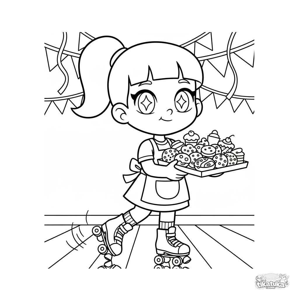 Página para colorir para 7-9 anos: uma menina de patins carregando uma bandeja de guloseimas por um salão festivo. Pose dinâmica, detalhe moderado, figura completa.