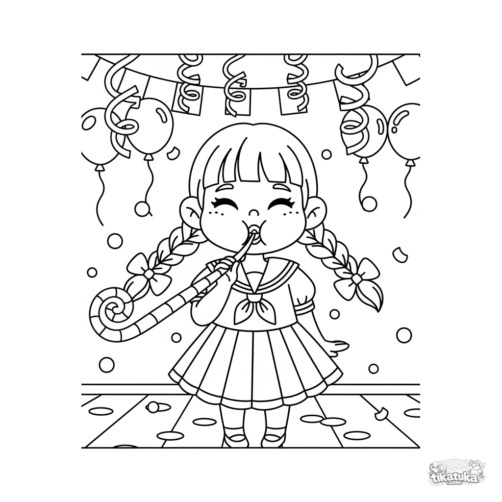 Página para colorir para crianças 4-6: uma menina alegre com vestido marinheiro sopra uma buzina de festa no centro de um salão festivo. Cena brilhante e dinâmica.