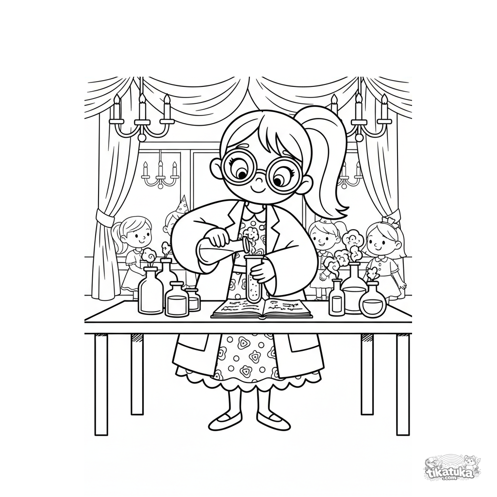 Página para colorir para pré-adolescentes 7-9: uma menina de jaleco conduz um experimento divertido de poções em uma mesa em um salão festivo. Cena dinâmica.