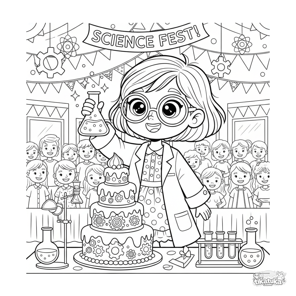 Página detalhada para colorir para meninas 10-12 anos: uma jovem cientista apresenta seu experimento de bolo em uma feira festiva. Muitos elementos para colorir.