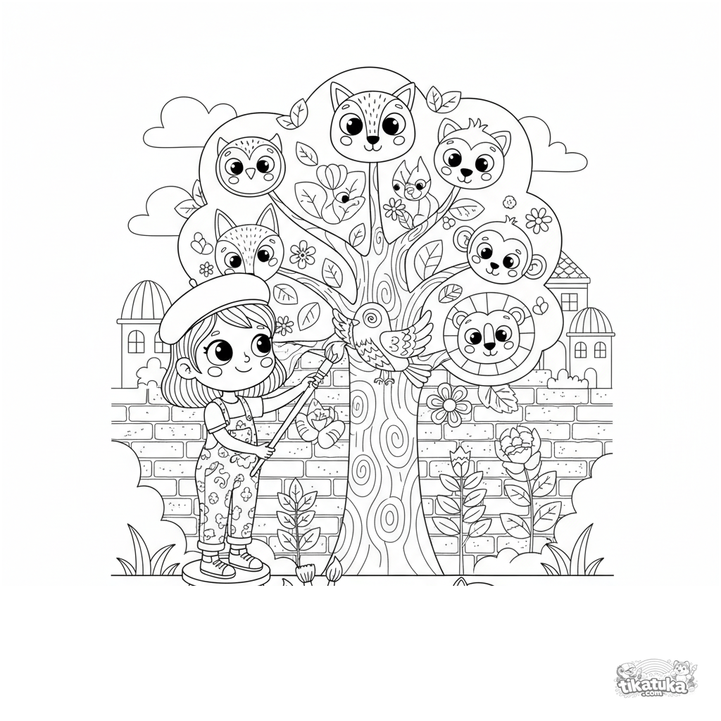 Página para colorir para meninas de 4-6 anos: uma jovem artista de boina pinta um mural gigante de uma árvore com animais em uma parede de tijolos. Cena sobre criatividade.
