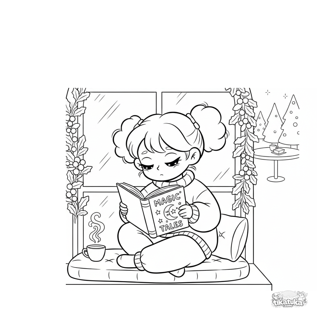 Página para colorir para meninas 7-9: uma menina se aconchega em um assento de janela em um salão festivo, lendo um livro grande. Cena calma e detalhada.