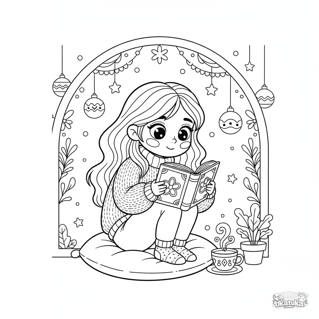 Página para colorir para crianças de 7-9 anos: uma menina de suéter aconchegante curte a leitura de um livro grande enrolada em uma almofada em um salão festivo. Corpo inteiro visível.