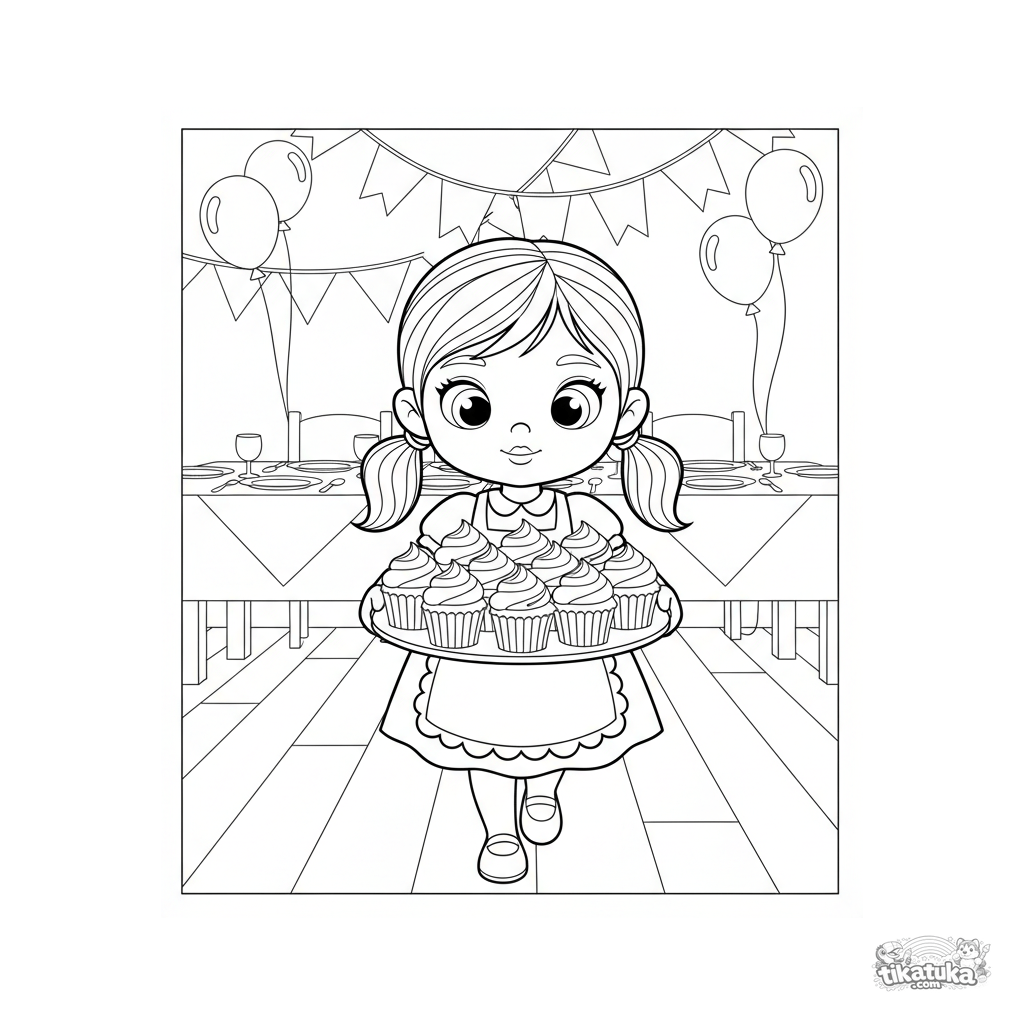 Página para colorir para crianças 4-6 anos: uma menina com avental carrega com cuidado uma bandeja de cupcakes em um salão festivo decorado. Com mesa de festa e bandeirolas ao fundo.