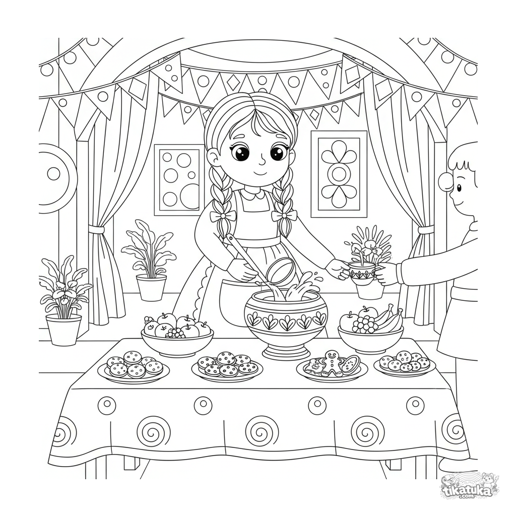 Página para colorir para crianças 4-6: uma menina com avental serve ponche em um salão festivo. Formas claras, ação compreensível.
