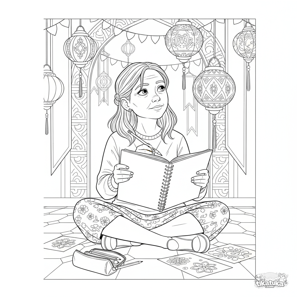 Página para colorir para crianças de 10-12 anos: uma pré-adolescente sentada no chão do salão festivo desenha ideias de decoração em um grande caderno de esboços.