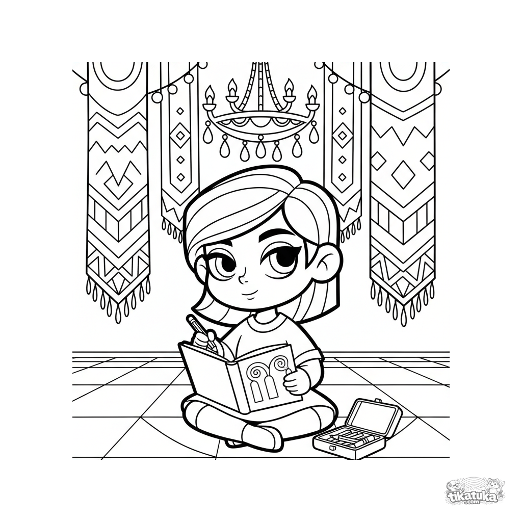 Página para colorir para crianças 7-9: uma menina artística desenhando as decorações de um salão festivo em seu caderno. Cena criativa.