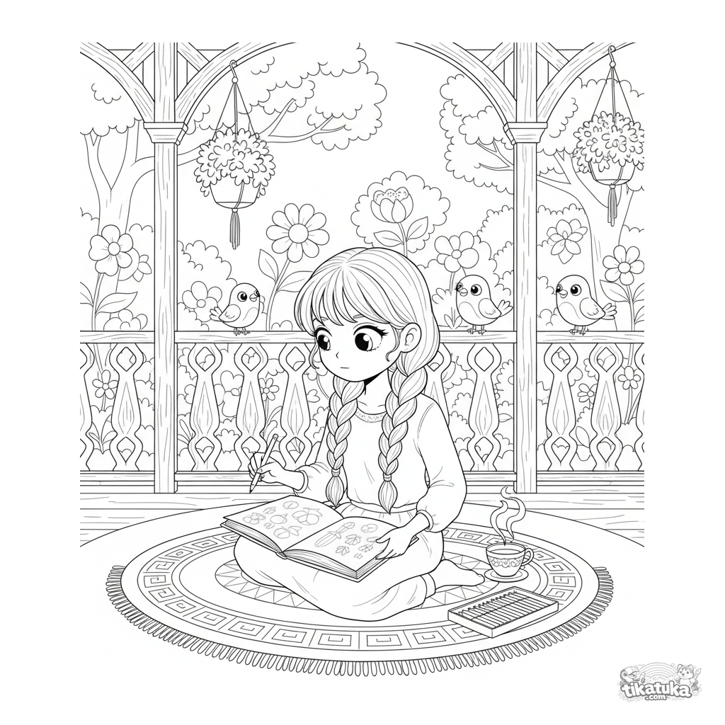 Página para colorir detalhada para crianças 10-12: uma menina desenhando o jardim sentada na varanda de uma dacha. Cena com lápis, chá e caderno de desenho.