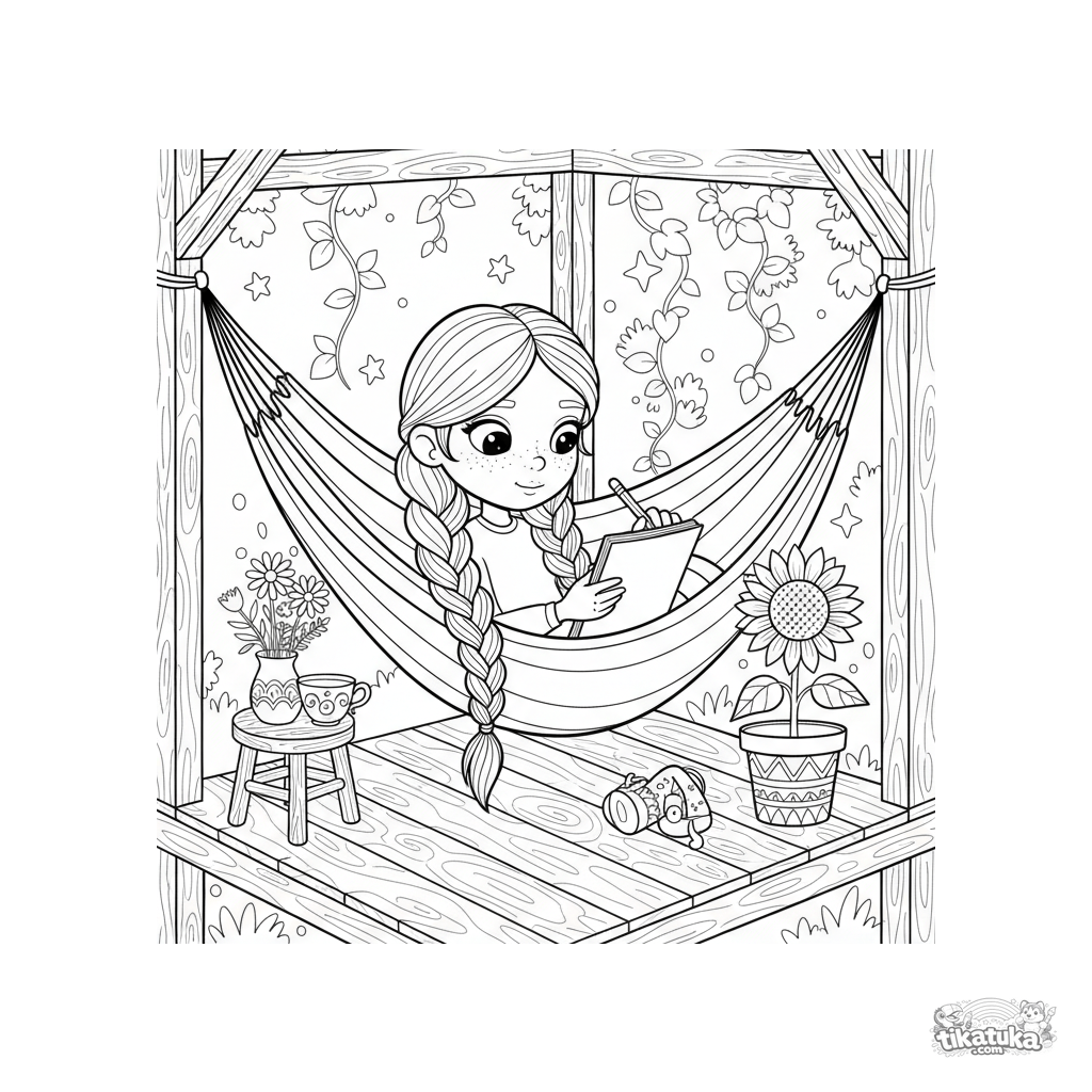 Página para colorir para crianças mais velhas de 10-12 anos: uma menina desenhando num diário enquanto está numa rede na varanda. Cena detalhada com xícara de chá.