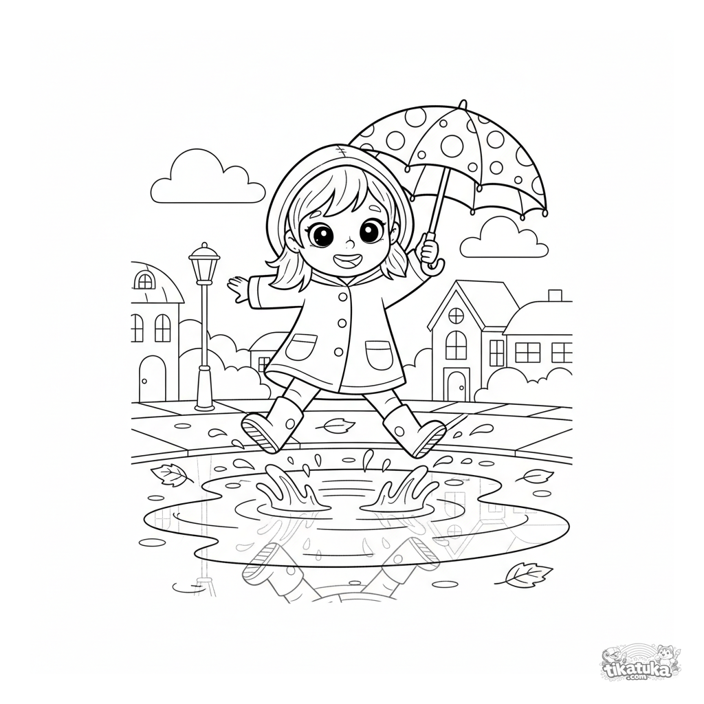 Página para colorir para meninas: uma menina feliz de capa de chuva pula em poças com guarda-chuva. Para crianças de 4 a 6 anos. Figura completa, margens amplas, humor alegre.