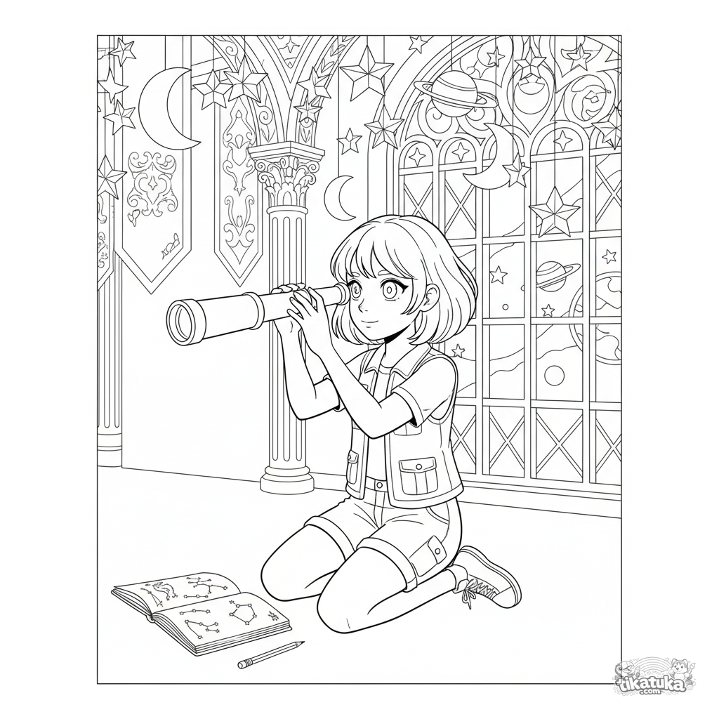 Página para colorir para crianças de 10-12 anos: uma jovem exploradora de colete olha com interesse através de um telescópio para as estrelas de uma janela em um salão festivo. Ilustração detalhada.