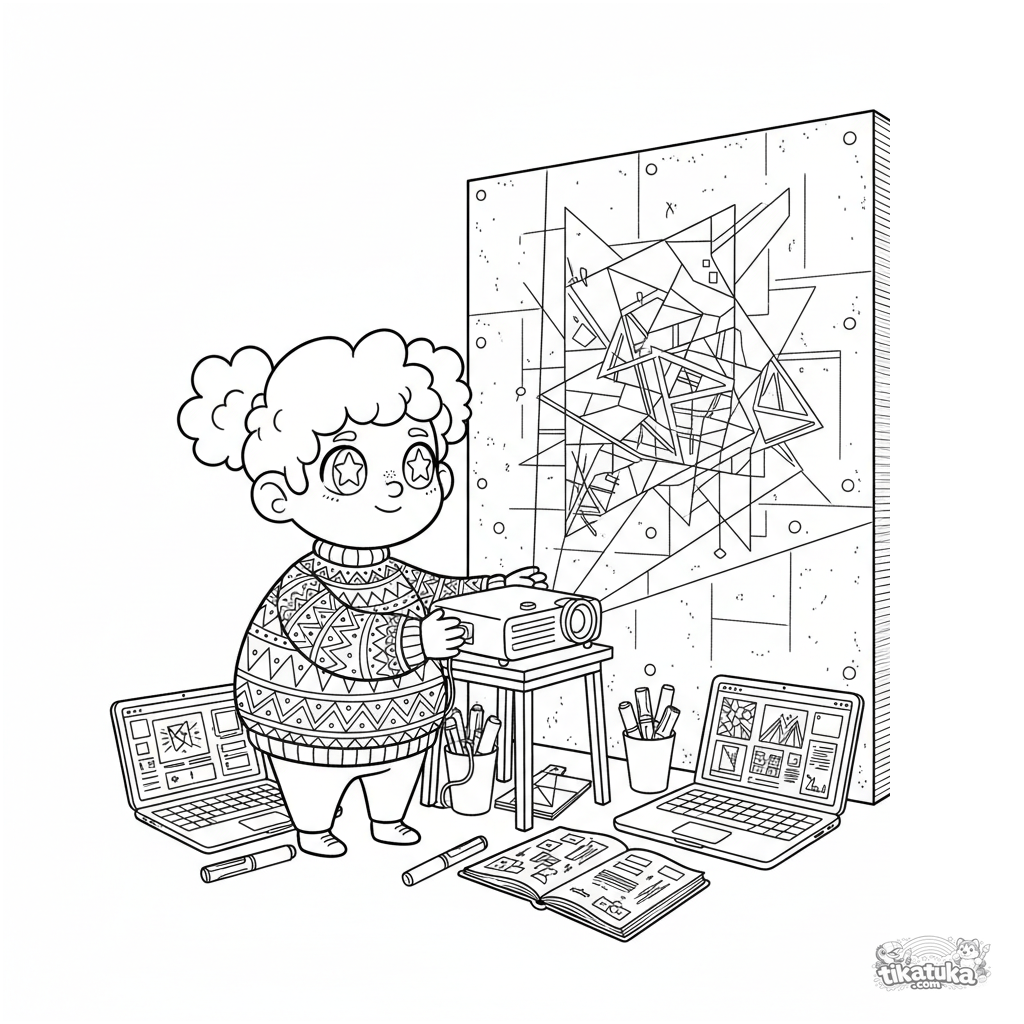 Página para colorir para crianças de 10-12 anos: um artista digital cria arte glitch com um projetor em um porão. Cena cheia de detalhes criativos.