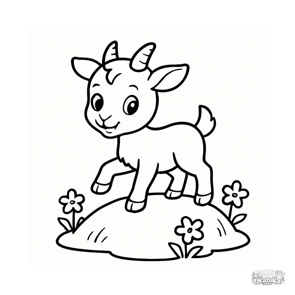 Página para colorir para crianças. Um cabrito brincalhão em cima de uma colina com flores roxas, pronto para pular. Download grátis.