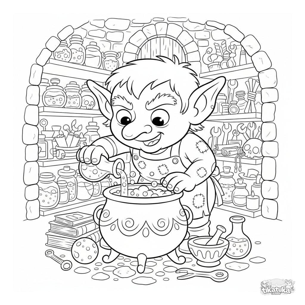 Página para colorir para 7-9 anos: um alquimista goblin cria uma poção mágica em sua oficina subterrânea bagunçada. Cena divertida e detalhada no estilo cartoon dos anos 90.