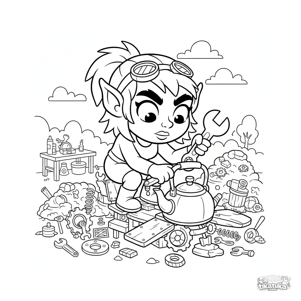 Página para colorir para crianças 7-9: um engenheiro goblin inventivo ajusta uma máquina voadora feita de sucata em sua oficina no ferro-velho.