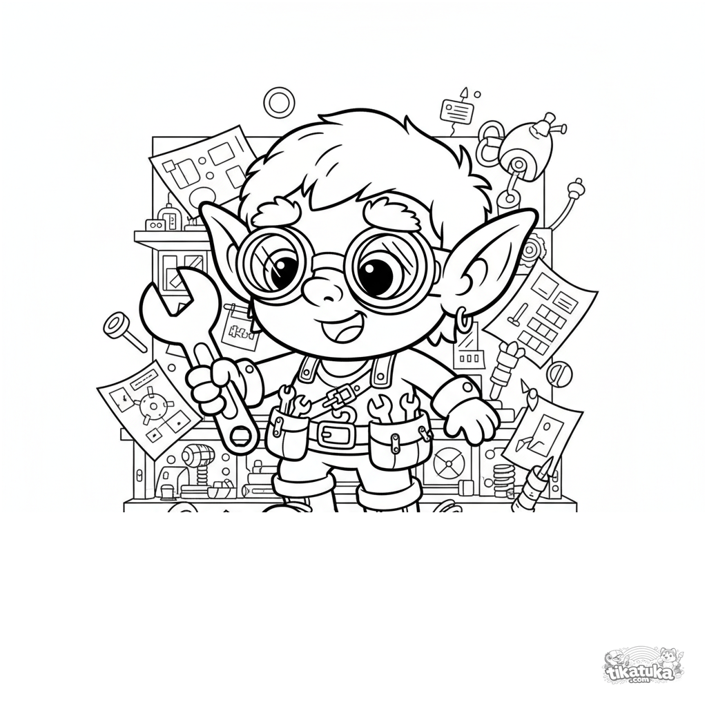 Página para colorir para crianças 4-6: um goblin inventor engraçado em sua oficina testando suas novas botas voadoras. Cena humorística e dinâmica.