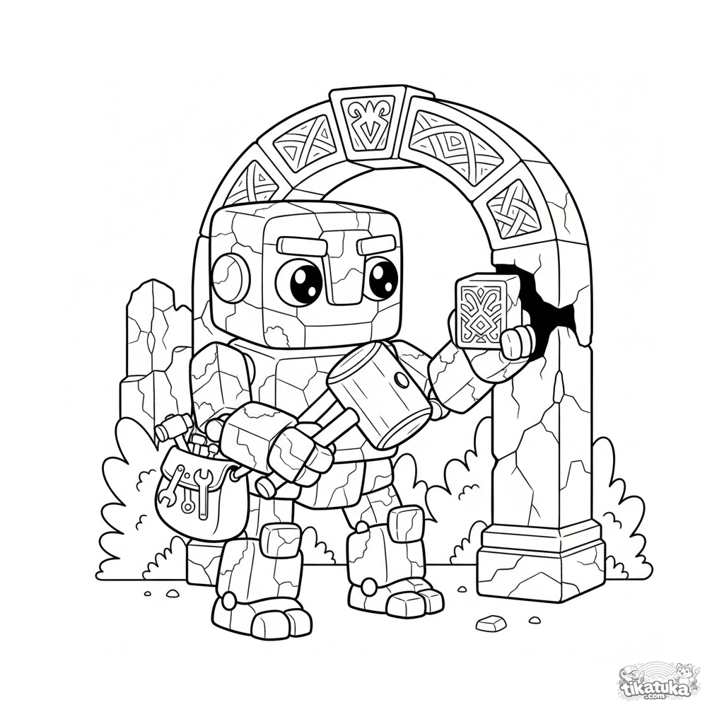 Página para colorir para 7-9 anos: um golem pedreiro repara um arco antigo em ruínas esquecidas. Cena de fantasia interessante com trabalho e ferramentas.