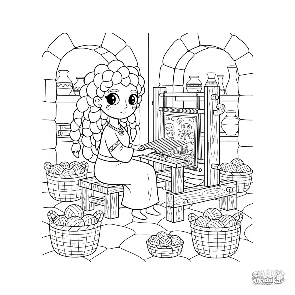 Página para colorir para crianças de 4-6 anos: uma das irmãs Górgona trabalhando em um tear no covil de pedra. Estilo folclórico brilhante, formas claras.