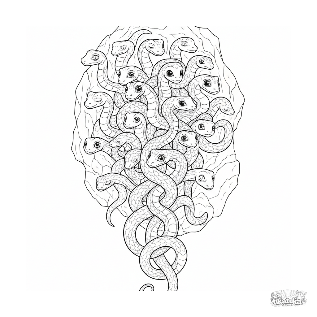 Página para colorir complexa para crianças de 10-12 anos: uma representação detalhada das tranças de cabelo de cobra da Górgona.