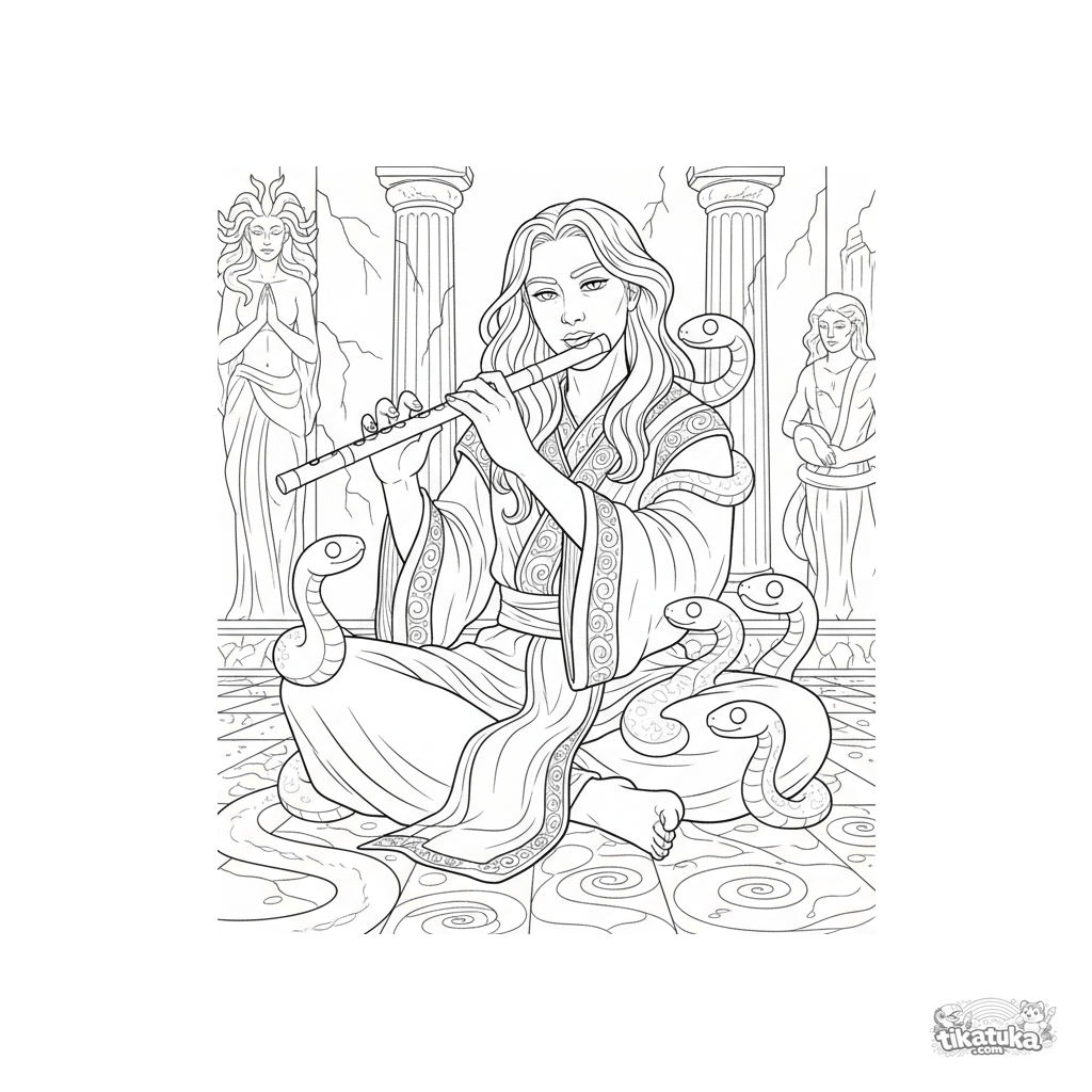 Página detalhada para colorir para crianças 10-12: um domador de serpentes toca flauta no covil da Górgona.